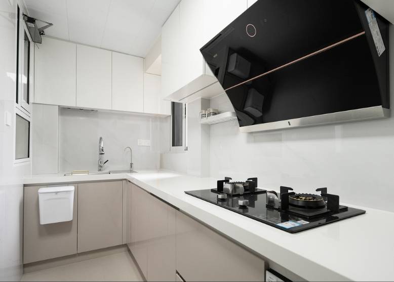 厨房L型布局,使用起来还是蛮顺手的。上下两层橱柜设计,提高了收纳能力。此外,色调不同也让空间更有层次。吊柜细节处理上也很到位,贴合了空间结构,整体更美观。 卫生间