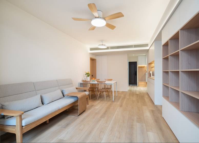 餐厨一体式格局,加上简洁的设计方式,空间宽松又不显臃肿。风扇式吊灯与餐厅吊灯的不同,实现了视觉上的隔断效果。取消了厚重的茶几,挑选了一款简易可移动的边几,占用空间少还实用。