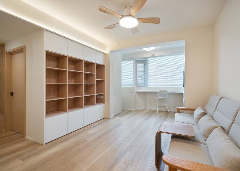 客厅轻松宽敞,由于是学区房装修上也有所不同,取消了电视和茶几等物件,保留宽敞的空间让小朋友拥有更多的玩耍空间。电视墙直接做储物柜,提供更多的收纳空间。