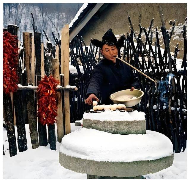 冬天的一个清晨,院子里,一位大叔正在往一个大盆里装冻住的粘豆包。冻粘豆包蒸好之后,蘸上白糖,吃起来格外香甜。冬天,东北的家庭常常把梨、饺子、肉类都埋在雪里储存,既能防止腐坏,也让食物保持新鲜。