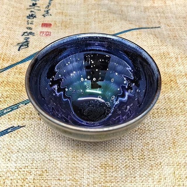 最著名的当属三件“曜变天目茶碗”。这种宋代建窑烧制的黑釉瓷碗,釉面在高温下形成如宇宙星云般的蓝色光斑,被誉为“天下神品”。