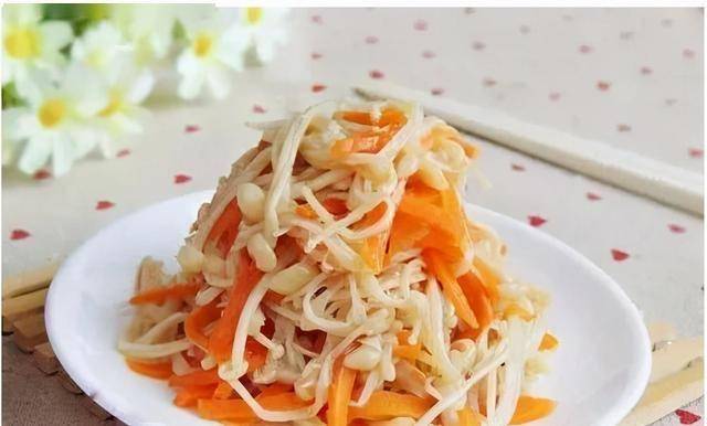 3. 胡萝卜拌金针:胡萝卜丝和金针菇焯水2分钟即可,过凉水后沥干,口感更脆;豆瓣酱炒出红油,料汁更香浓。