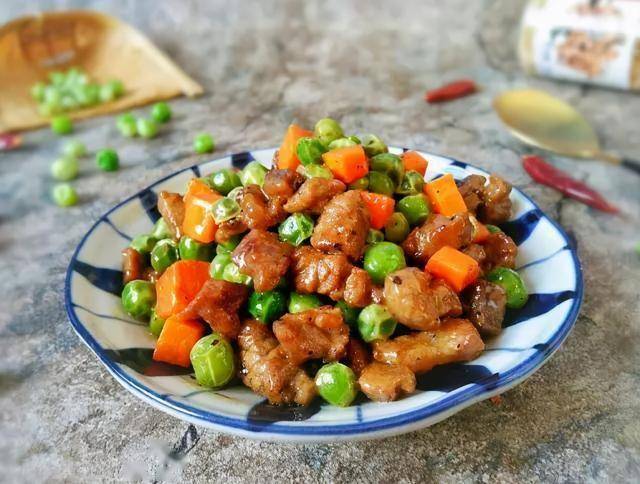 7. 豌豆牛肉粒:牛肉块炒至收紧后加开水焖煮10分钟,更软烂;豌豆和胡萝卜焯水后再炒,缩短后续烹饪时间。