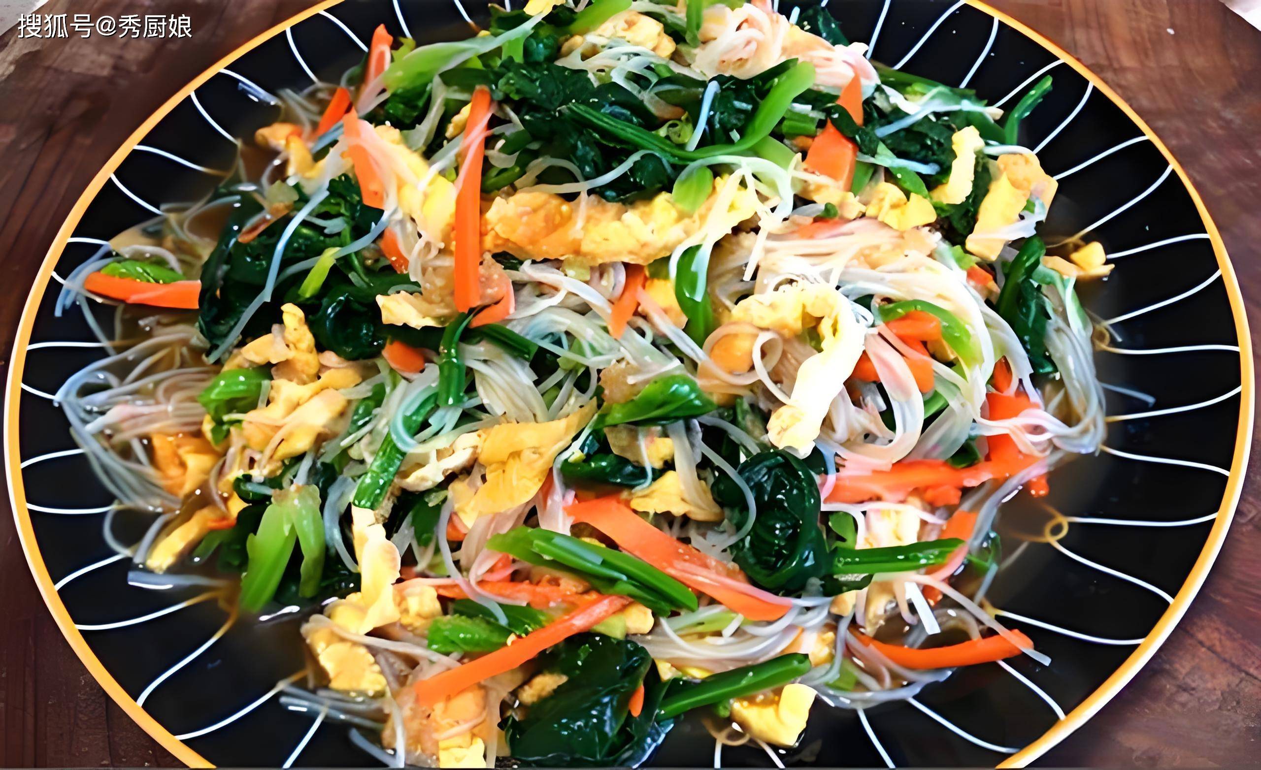 5. 混合食材:将所有处理好的菠菜、粉丝、胡萝卜丝、鸡蛋丝放入大盆中,淋上调好的酱汁,充分拌匀即可。
