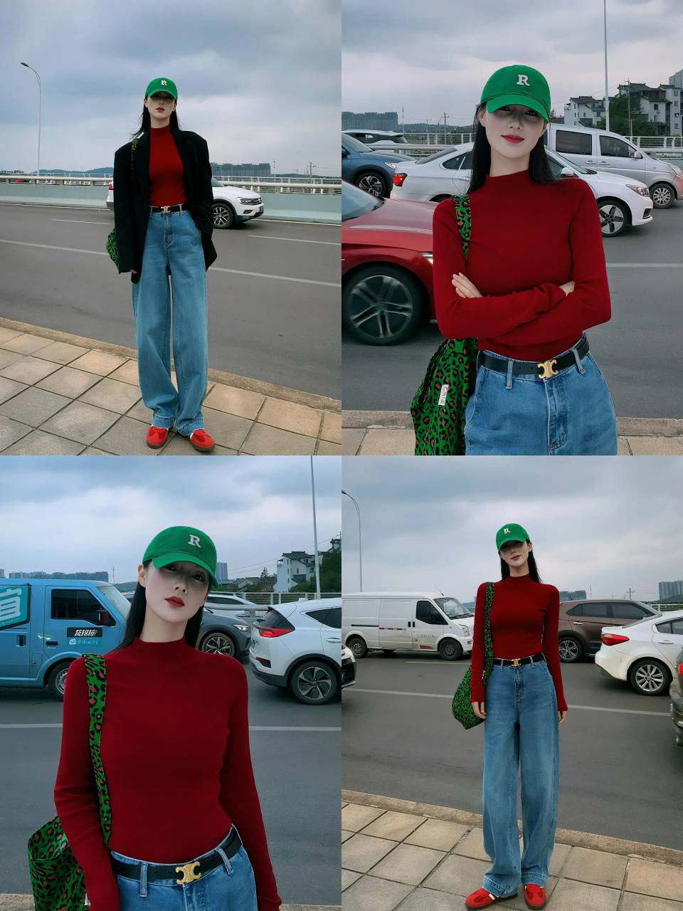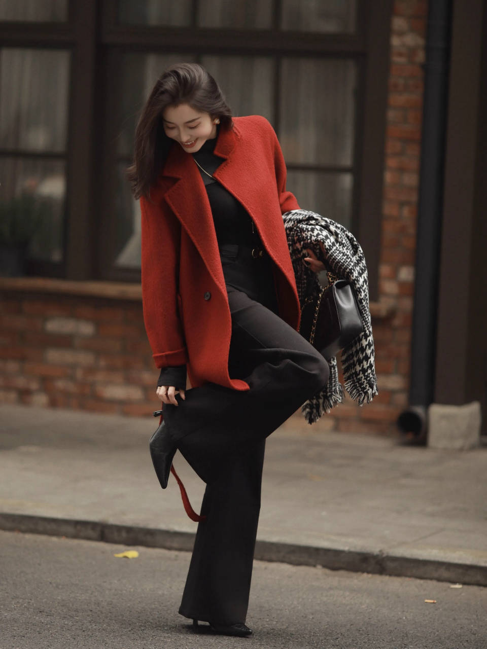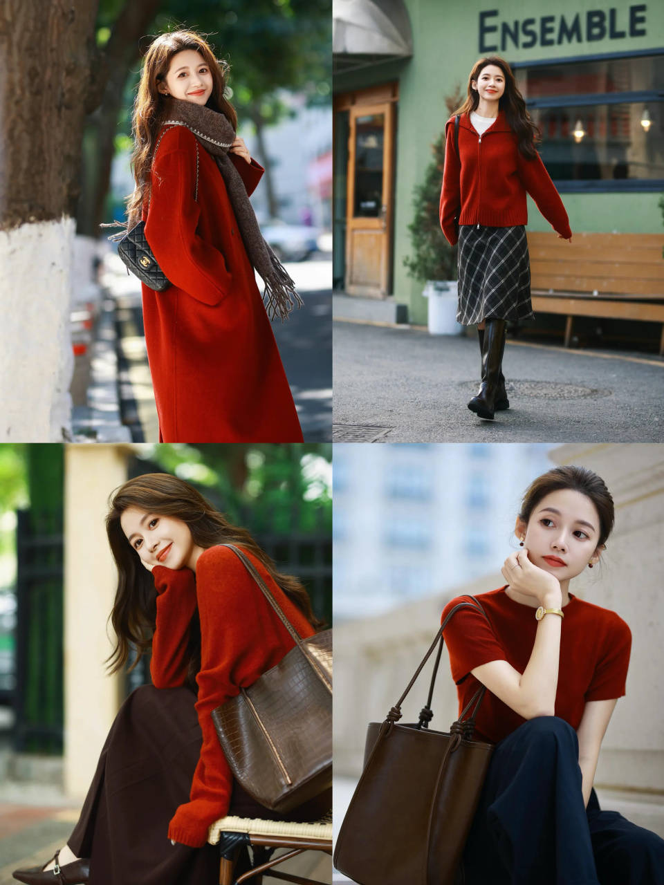 一身红毛衣叠红大衣,下搭半身裙与黑色阔腿裤,明艳又不失利落,是街头最亮眼的风景。