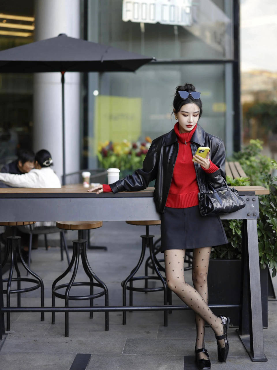 感觉自己穿一件红色的大衣还是过于张扬的情况下,我们可以选择一件黑色的短皮衣外套内搭半高领的红色毛衣,结合深灰色的 A 字短裙,脚穿方头单鞋,搭配一条波点的保暖丝袜,让你形成下半身失踪穿搭技巧,呈现出你的好身材。