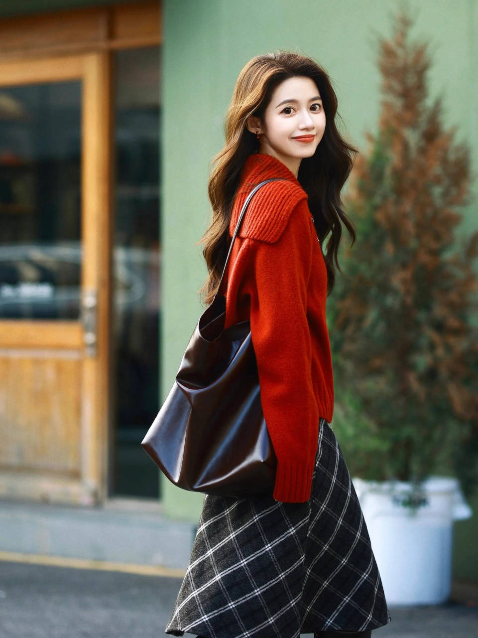 想让穿搭优雅得体,南方城市的姑娘可以选择一件红色的针织毛衣开衫,搭配上高腰收腰款的灰色菱形格纹 A 字半身裙,加上棕色的单肩包,结合大波浪卷发造型。就能使得穿搭者变得温柔、俏皮又有活力感。