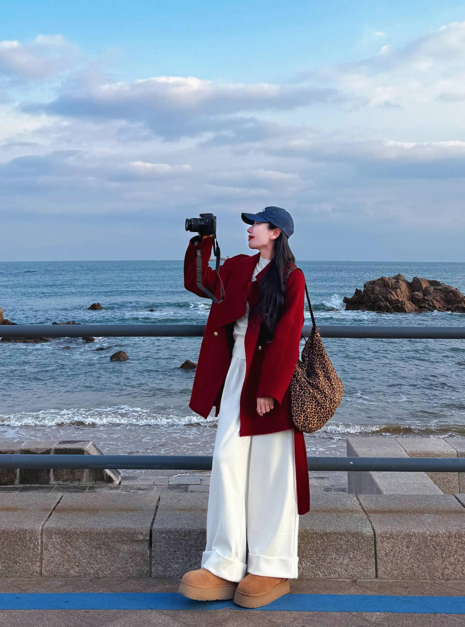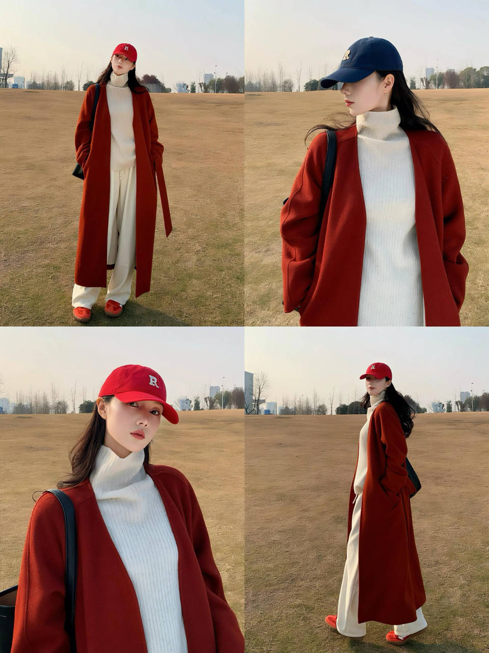 个子小巧的你,我们可以选择中长款的红色大衣,大衣的长度,衣角卡在大腿中间的位置最佳,能遮住胯宽腿粗的问题。内搭白色的毛衣,下装选择一条白色的阔腿长裤,脚穿驼色的雪地靴,红的明艳撞着白的干净,站在海边的风里格外亮眼。