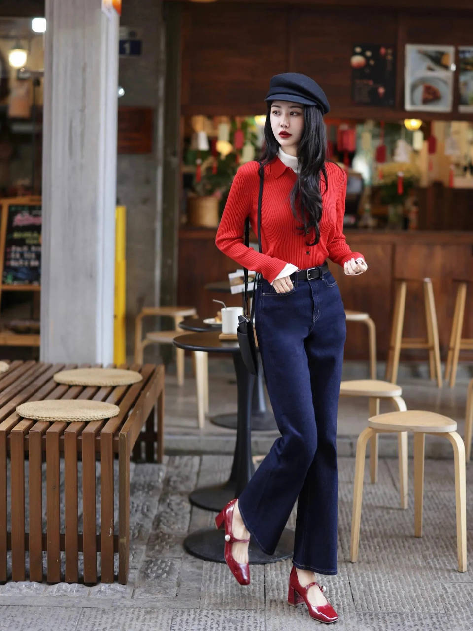 生活在南方城市的女性,完全可以选择一件红色的针织开衫,内搭一件白色的毛衣,形成叠加效果,再加上一条蓝色的牛仔直筒长裤,脚穿红色方头粗跟单鞋,头戴个性十足的黑色贝雷帽,就能使得穿搭者活力感满满,同时精致洋气。