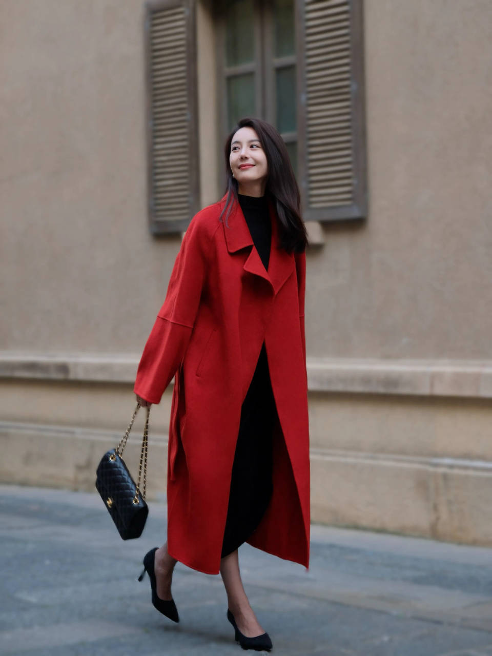 一袭黑色连衣裙衬出苗条身姿,脚上穿的黑色的高跟鞋叩响街边石板 ,加上红色的大衣外套,脚步轻缓,回眸或驻足,皆是不动声色的风景。黑色的高跟鞋是成熟女性独有的韵致。