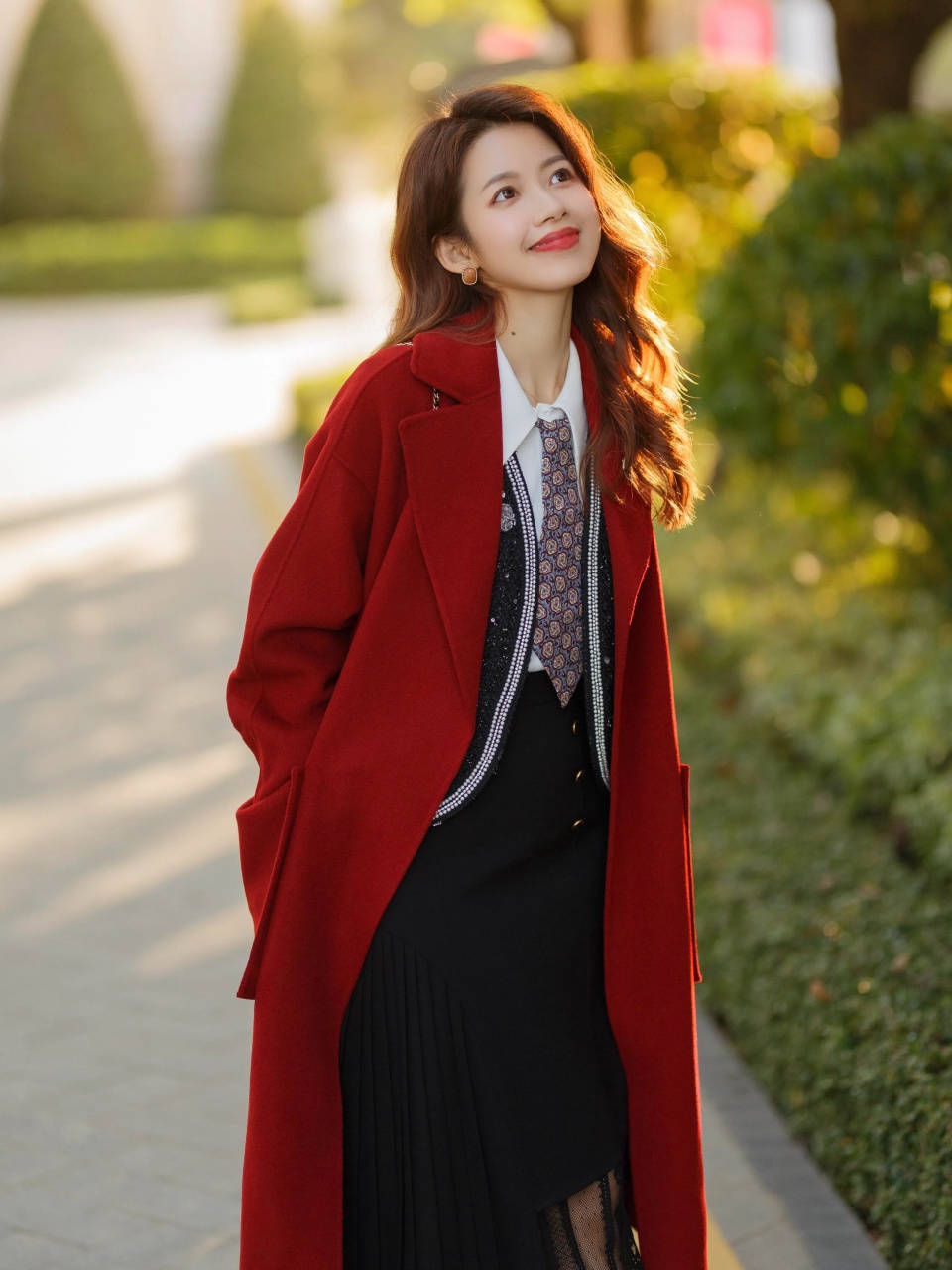 冬季最适合用叠加的搭配方式,一件翻领的红色长款大衣,内搭小众设计的小马甲,叠穿白色衬衫,加上藏蓝色的直筒半身裙,这样的穿衣配色经典耐看,很适合回家过年的时候穿搭。