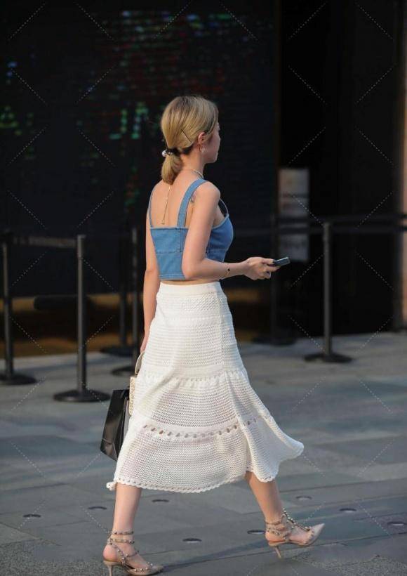 例:浅蓝牛仔拼接网纱的长款包臀裙,牛仔的硬朗被网纱的朦胧中和,网纱下摆的“若隐若现”带着小女生的羞涩,而牛仔的挺括则保留了包臀裙的利落,成熟中藏着可爱的小心机。