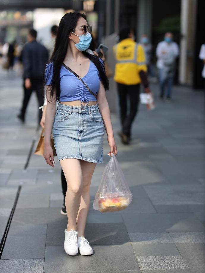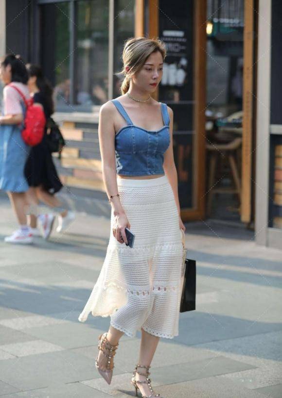 例:牛仔长款包臀裙搭配白色上衣+运动鞋,白色上衣的简洁与运动鞋的休闲,中和了包臀裙的成熟,整体造型简单大气,可爱的同时又不失时尚感,像邻家女孩般亲切却又有女人味。