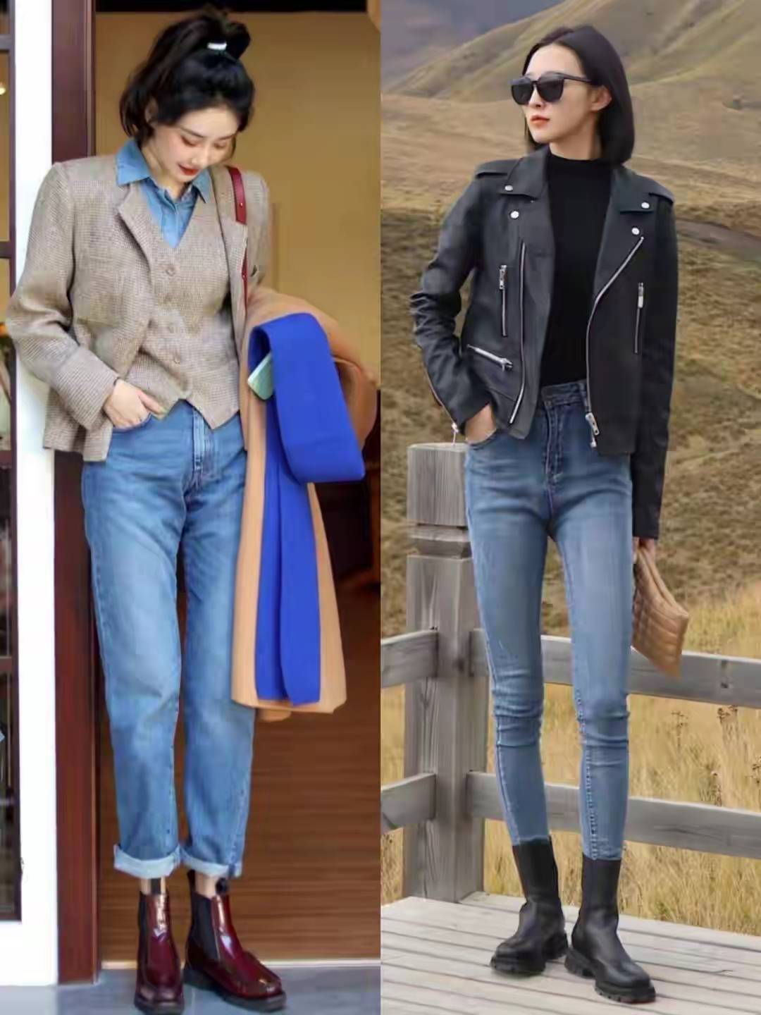 上面这两套穿搭给我们的感觉都很时尚,但是右边的这一条牛仔紧身裤加上黑色的皮衣外套,普通大众女性的身材根本就驾驭不住这条紧身裤,除非你也拥有这么修长笔直的大长腿。