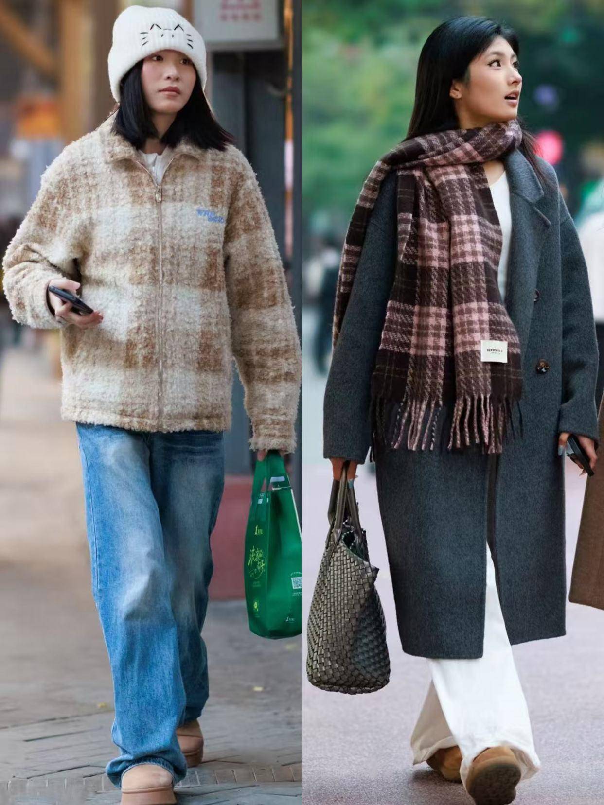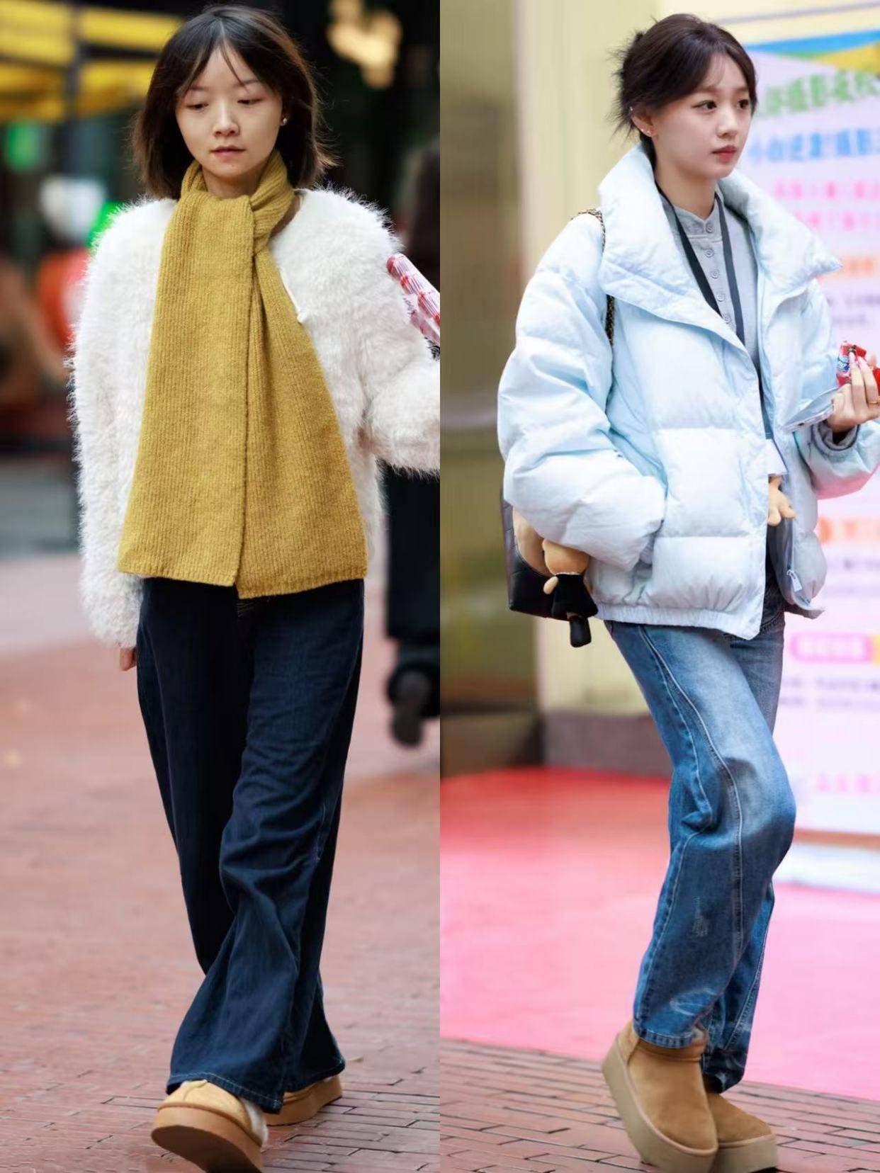 例如上面用驼色的雪地靴搭配上牛仔裤,加上皮草外套和羽绒服外套,显得就很个性时尚。