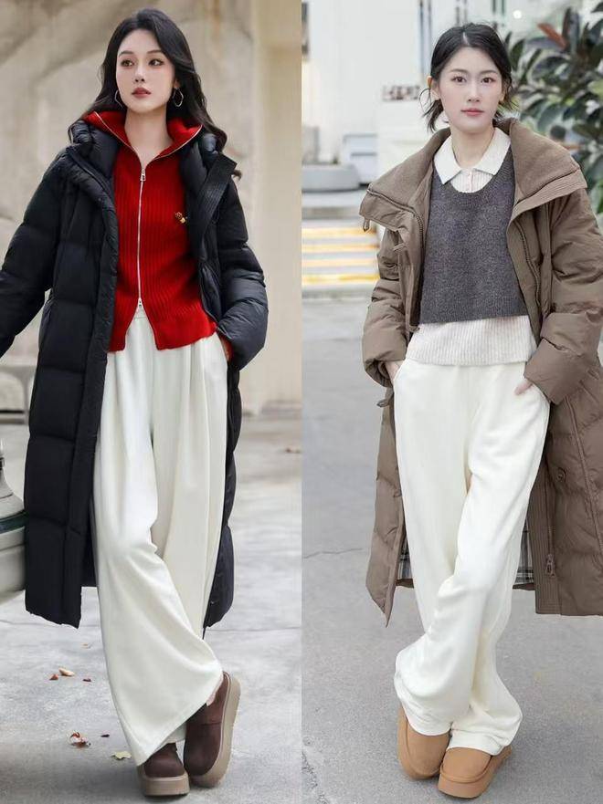 高级感:红色羽绒服+白色阔腿裤+黑色短靴(红白撞色,打破羽绒服的厚重感,显高挑)。