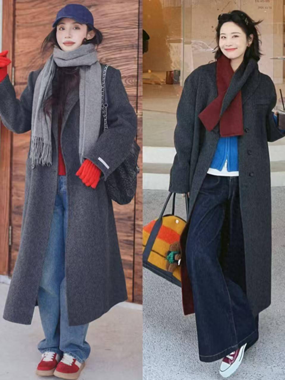 例如上面这两位时尚达人,用灰色大衣内搭针织毛衣,加上一条牛仔直筒阔腿裤,脚穿红色德训鞋和帆布鞋就能轻松 get 到时尚感,加上红色的毛衣,围巾,手套来点亮整个造型的配色,使得穿搭者超级蓬勃。