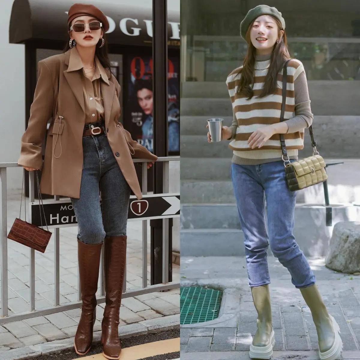 我们应该选择上图左边的这条灰色的紧身裤,紧致贴合腿型,更加容易呈现你的美腿,加上棕色的中筒靴和打底色系的西装外套和加衬衫,就能让你变得很干净。不过推荐你里面再加上一件毛衣,会更保暖。