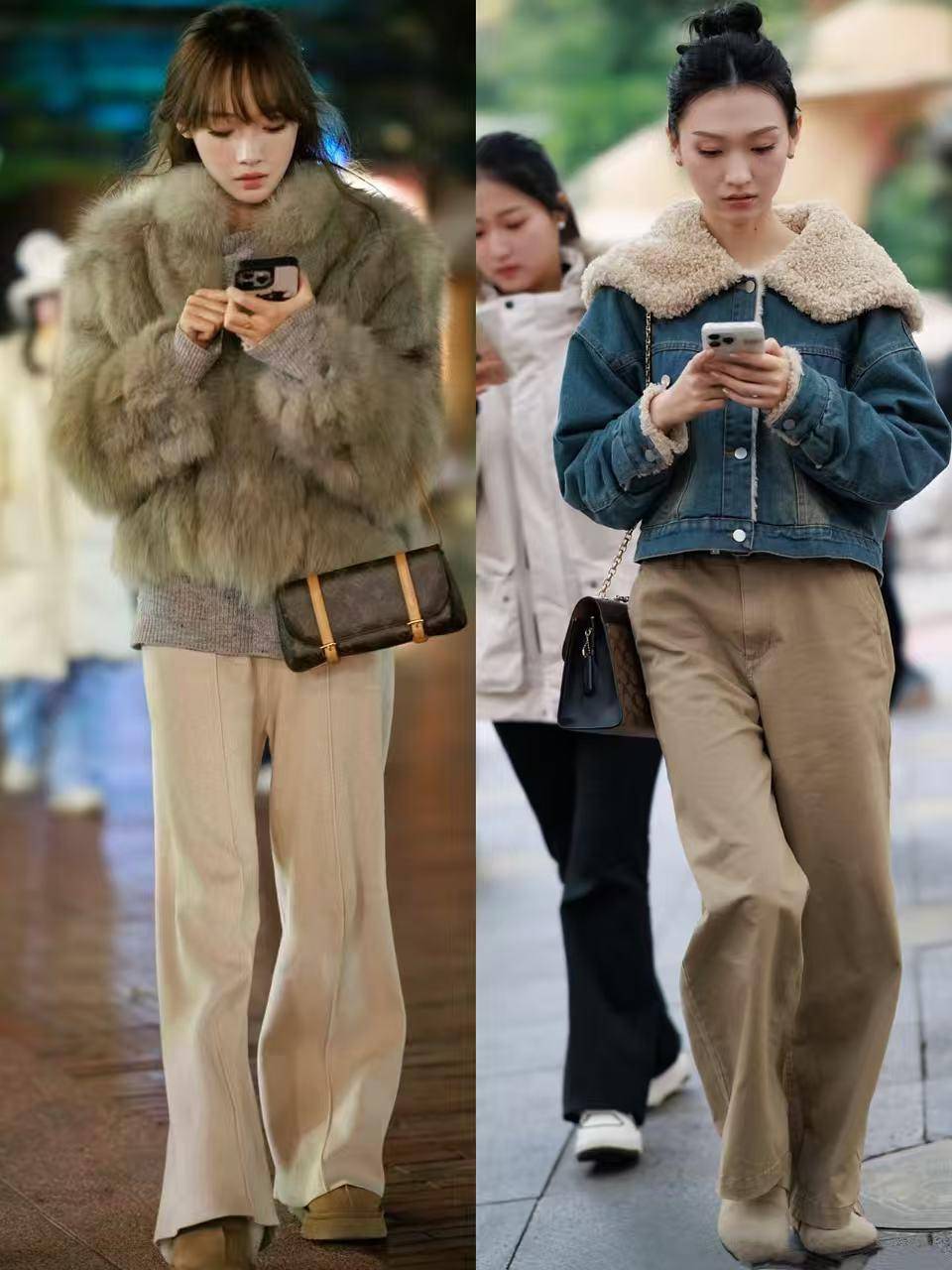 这个冬季还有一双鞋子也非常流行,那就是勃肯鞋,这双鞋的造型很独特,鞋头有点像芒果的形状,穿在脚上确实很时髦。而且都是大地色系,就像上面这两位时尚达人穿的勃肯鞋,搭配上卡其色的阔腿长裤,加上皮草和牛仔短外套,就能轻松 get 到时尚感和高级感。