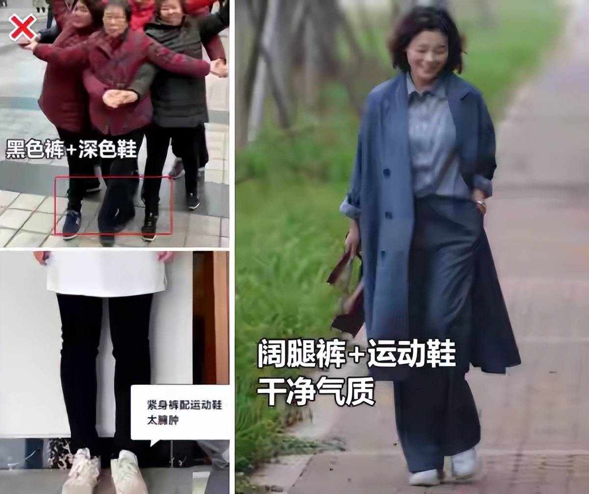 对于我们普通大众来说,穿裤子尽量穿松不穿紧,毕竟身材比例没法和模特或者是女明星媲美。穿了一条紧身裤和运动鞋会显得臃肿,暴露腿部缺点,选择阔腿裤加上运动鞋干净有气质
