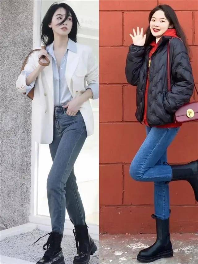 上面这两双黑色的短靴对比非常明显,更推荐右边的这一双简约设计的短靴,搭配上蓝色的牛仔紧身裤和红色的卫衣加黑色棉服,这身打扮更经典时尚。
