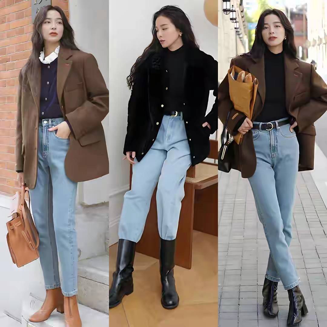 更推荐你选择左边的这一条,蓝色的牛仔收脚裤,搭配上棕红色的短靴和燕麦色的西装外套,叠穿同色系的马甲和一件是衬衫,就能使得你干练又洋气。感觉冷的话,可以把手里的这件驼色大衣披上,瞬间让你感受到温暖。