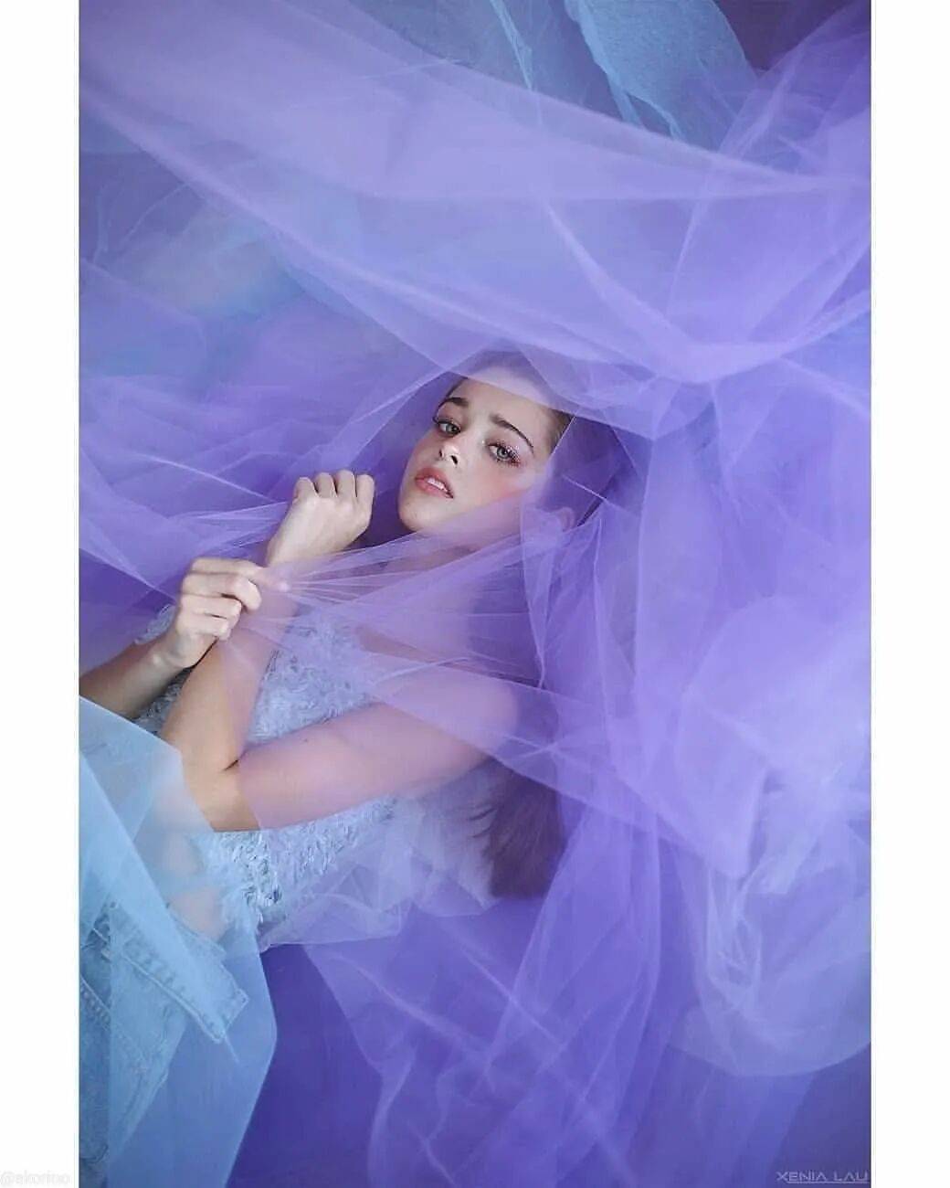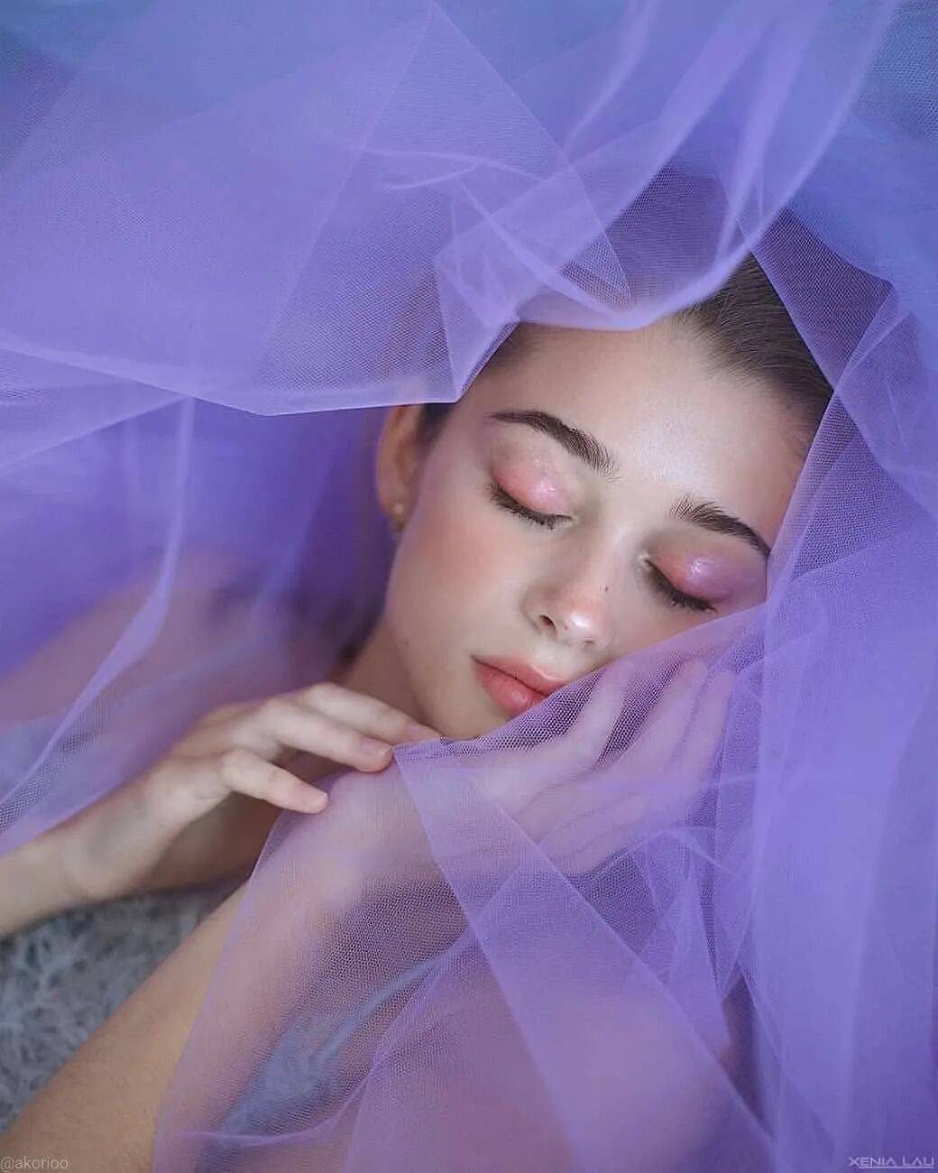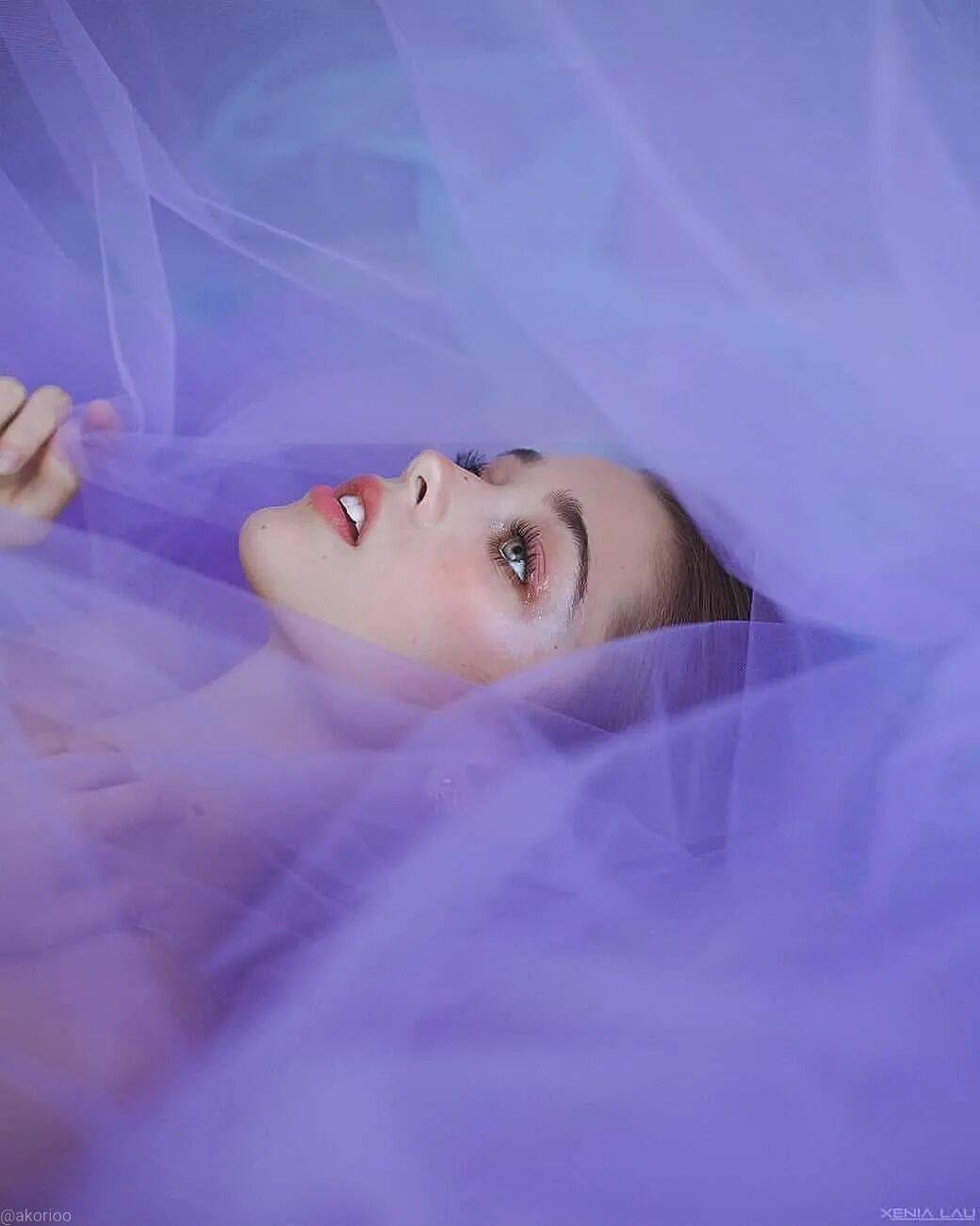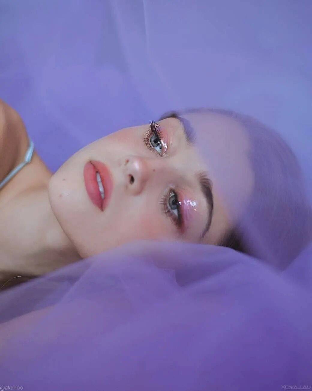 图片6:女性侧卧,部分面部被紫色薄纱覆盖,双眼大而有神,睫毛纤长。她并未看向镜头,而是沉浸在某种内在情绪中——可能是回忆,也可能是梦境。她的美未被“使用”,因而完整。