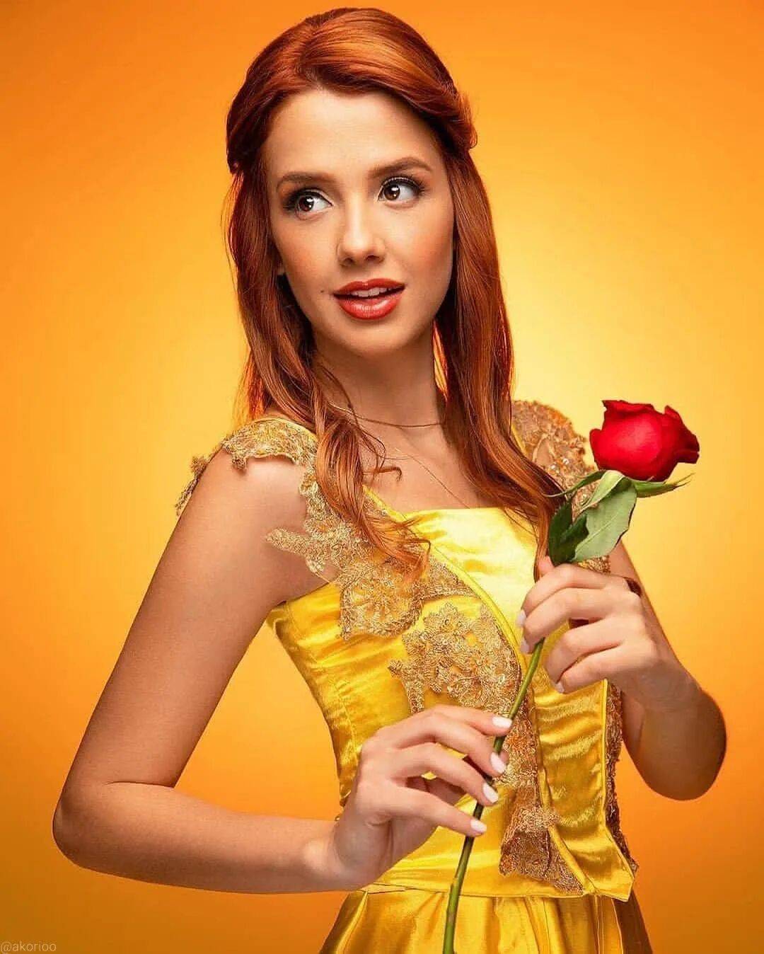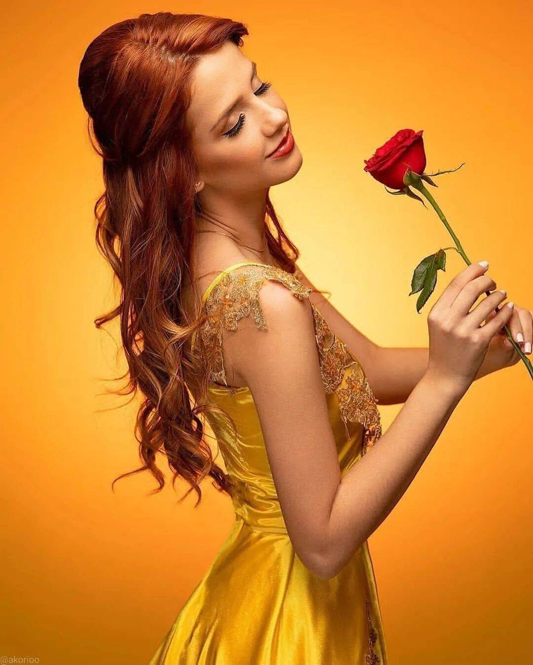 图片2:红棕卷发女子持红玫瑰,黄礼服配金蕾丝,背景橙黄交融。她像是从油画中走出的贵族少女,但她的眼神空茫,似乎正经历一场内心的告别。她的美不仅在外表,更在她未曾言说的故事里。