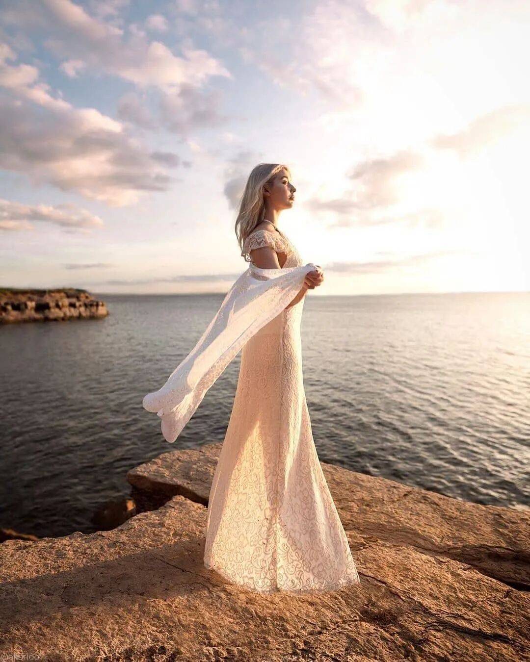 图片15:金发女子立于岩石之上,面朝大海,白裙随风轻扬。构图极似波提切利《维纳斯的诞生》——她是海的女儿,自浪尖而来。夕阳为其镀上圣光,天地为之屏息。