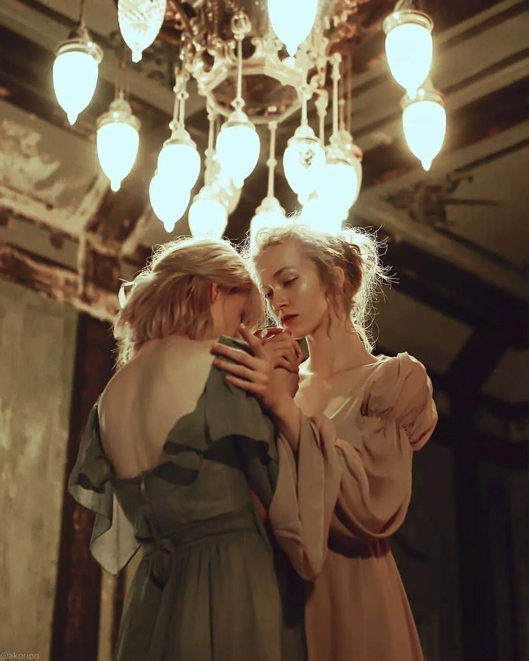 图片13:两位女性相依,绿色露背裙与浅棕裙形成对比,复古吊灯营造出剧场氛围。她们的关系模糊——是姐妹?恋人?对手?这种性别与情感的不确定性加剧了视觉张力。