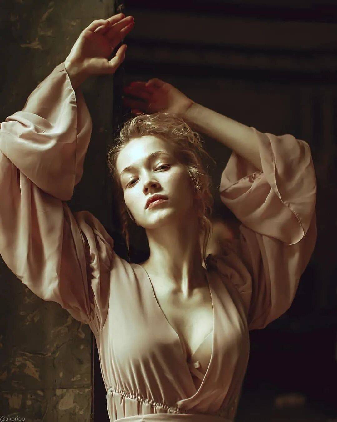 图片12:浅粉色深V长袖服饰女子双臂抬起,卷发蓬松,暗背景中面部受光。她的造型介于古典与哥特之间,既有诱惑力又有压迫感。这是一种“危险的美”——既吸引又排斥。