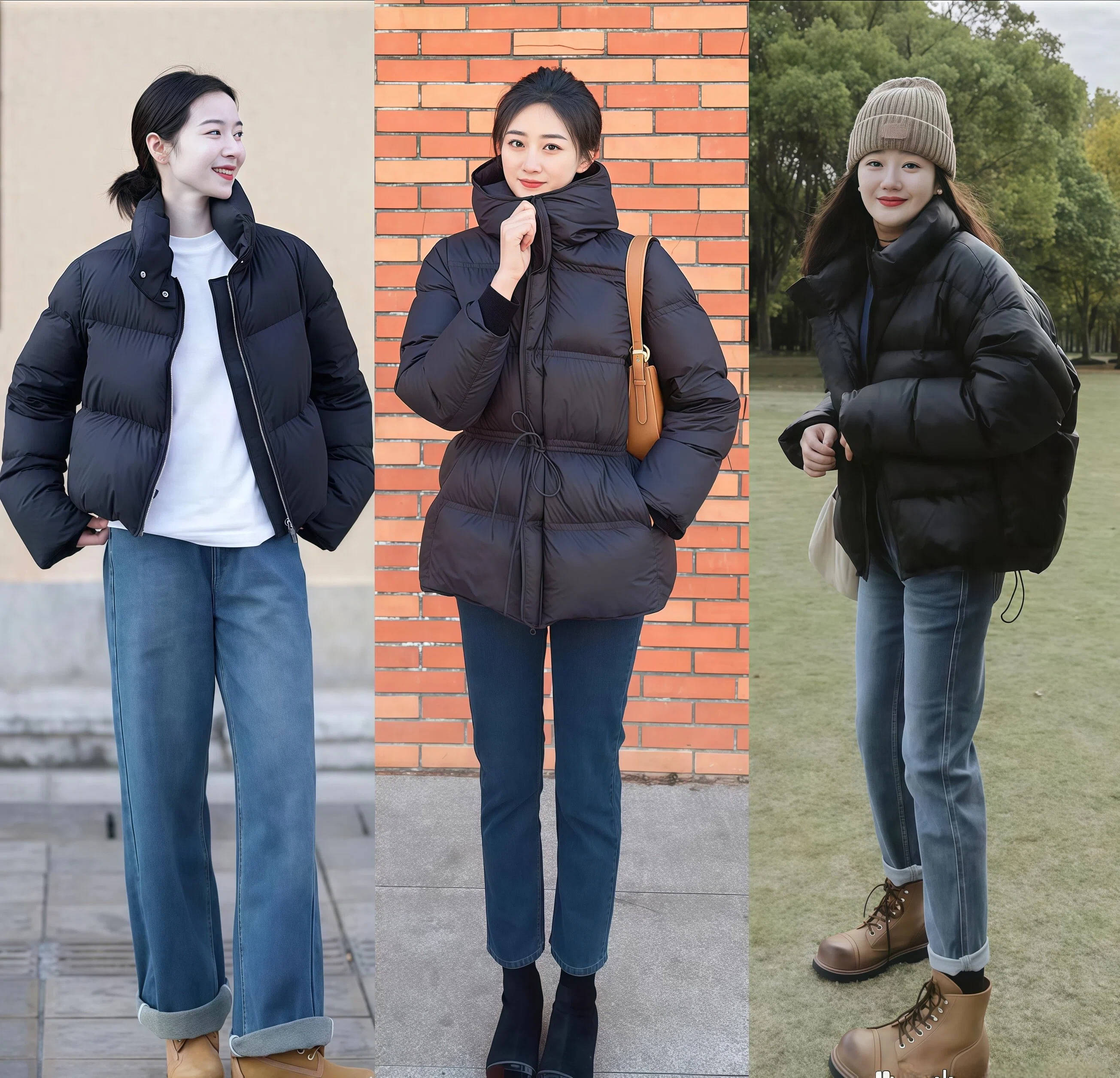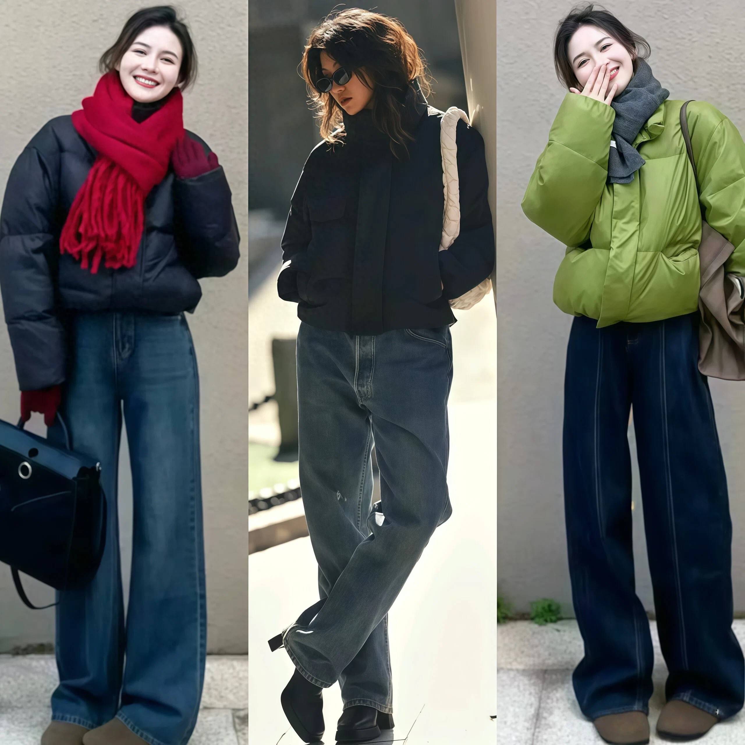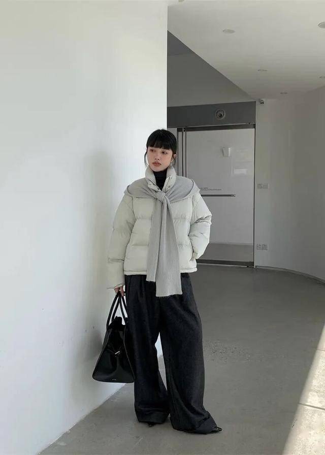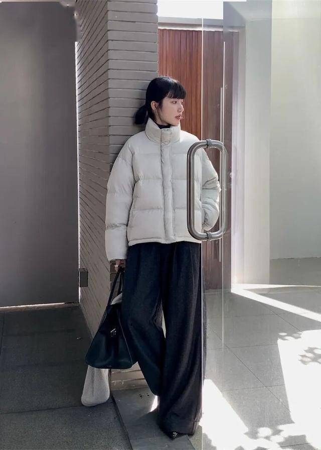 短款羽绒 + 直筒裤    卡其/灰短款羽绒    黑色高腰直筒裤    白色运动鞋/马丁靴    休闲减龄,学生党友好