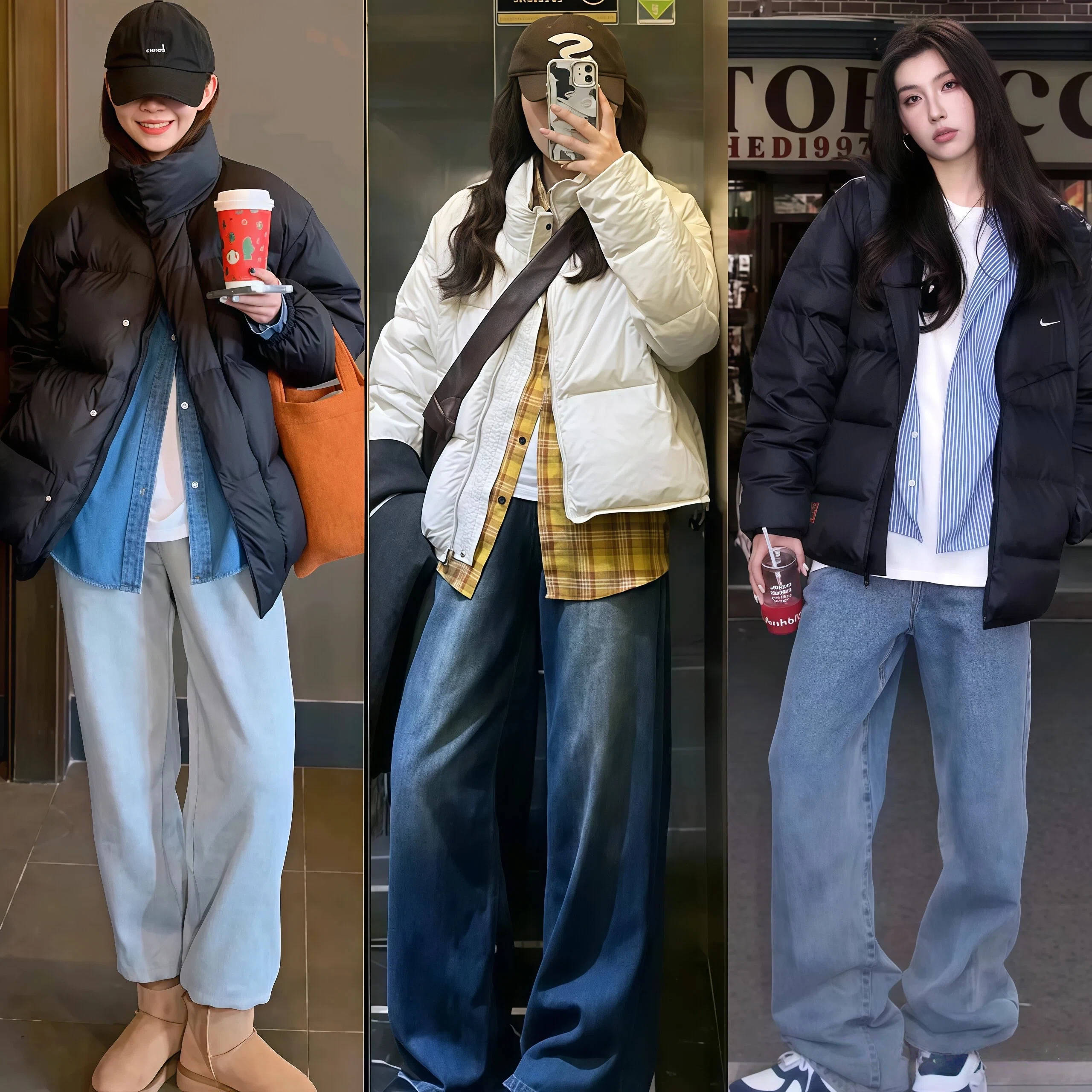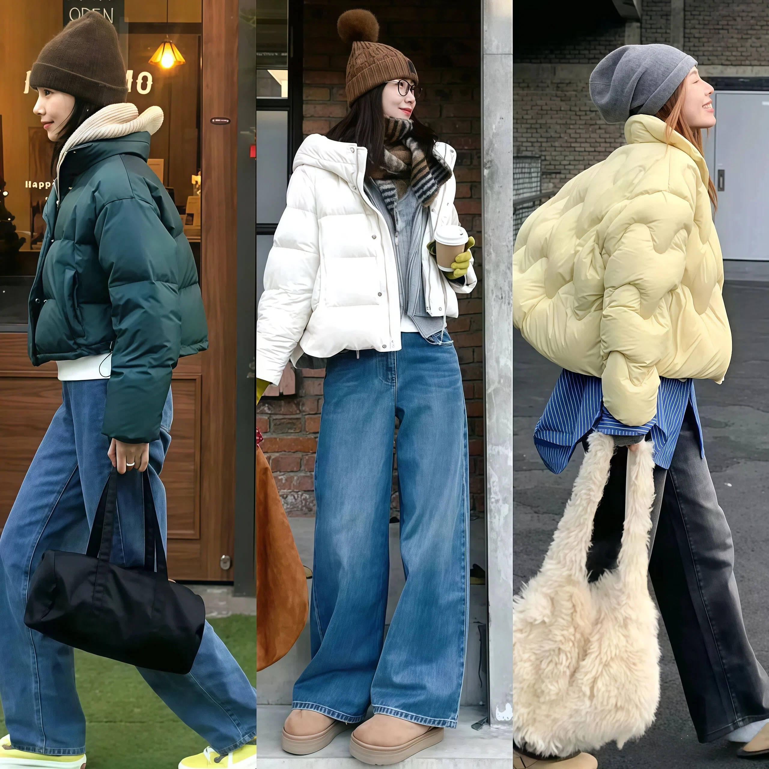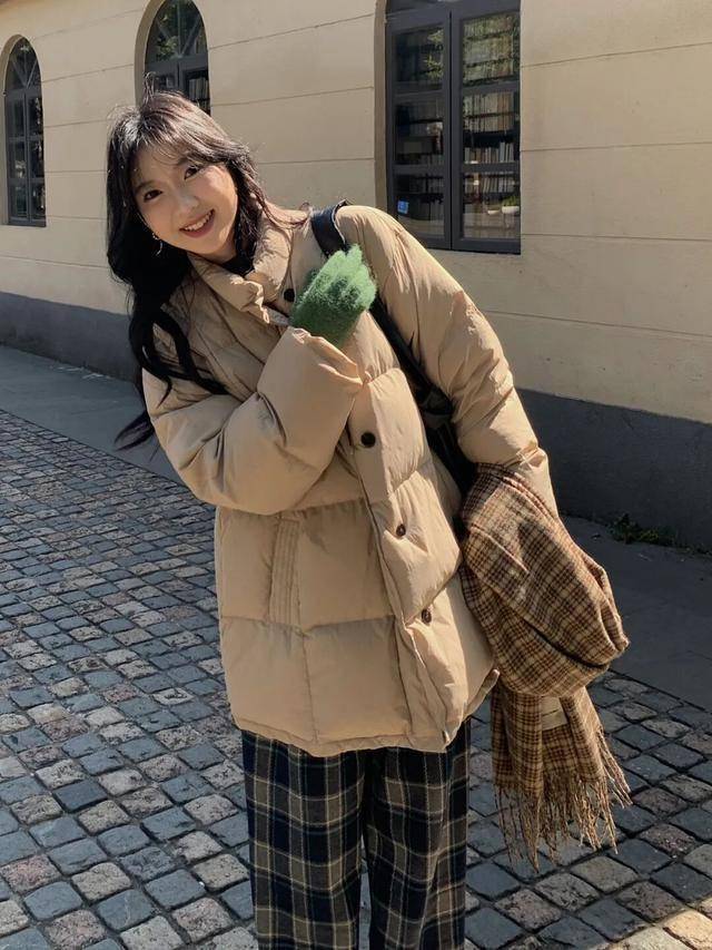 短款羽绒 + 直筒裤    卡其/灰短款羽绒    黑色高腰直筒裤    白色运动鞋/马丁靴    休闲减龄,学生党友好