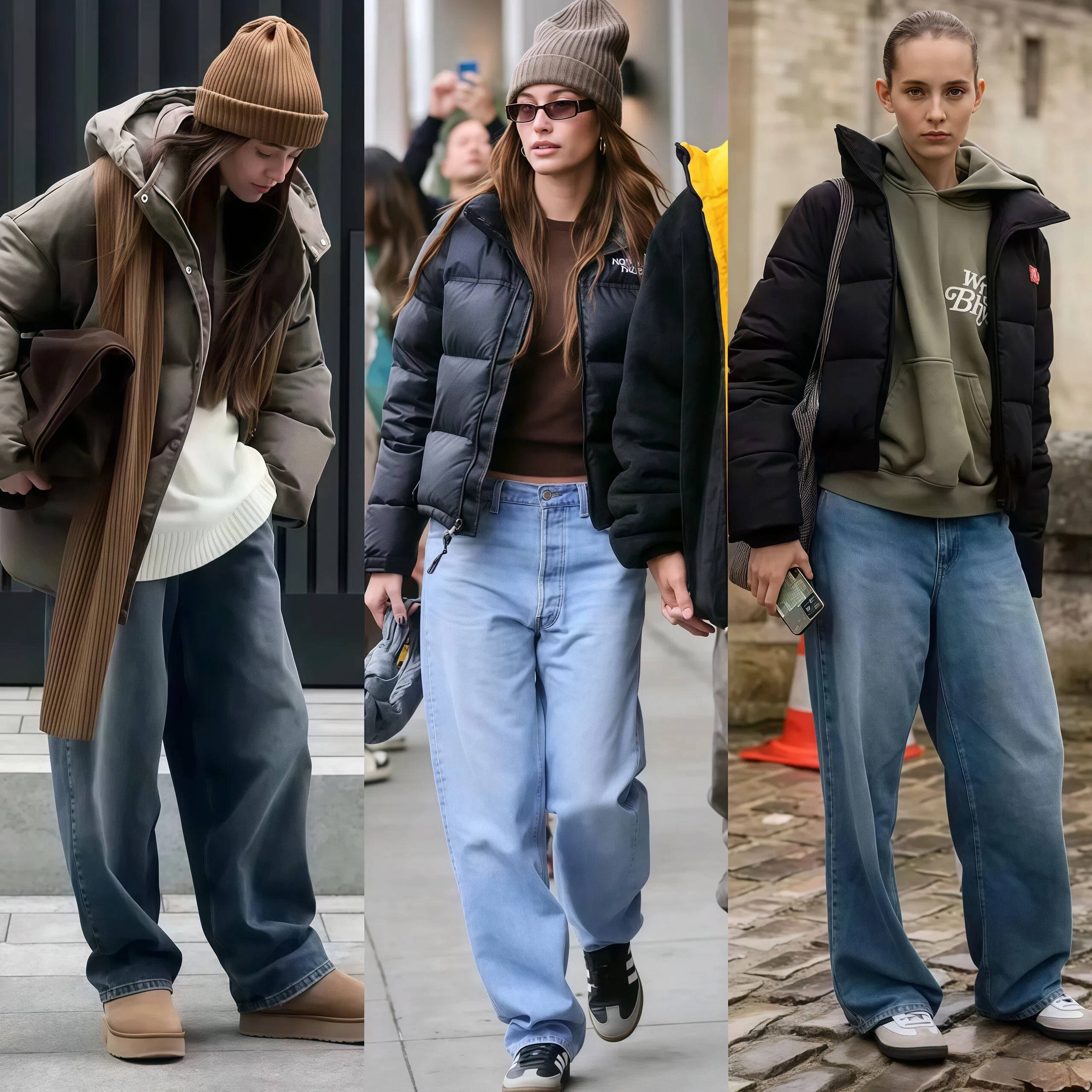 短款羽绒 + 牛仔裤    廓形短羽绒    高腰九分牛仔裤    高帮帆布鞋    利落显高,挽裤脚更清爽