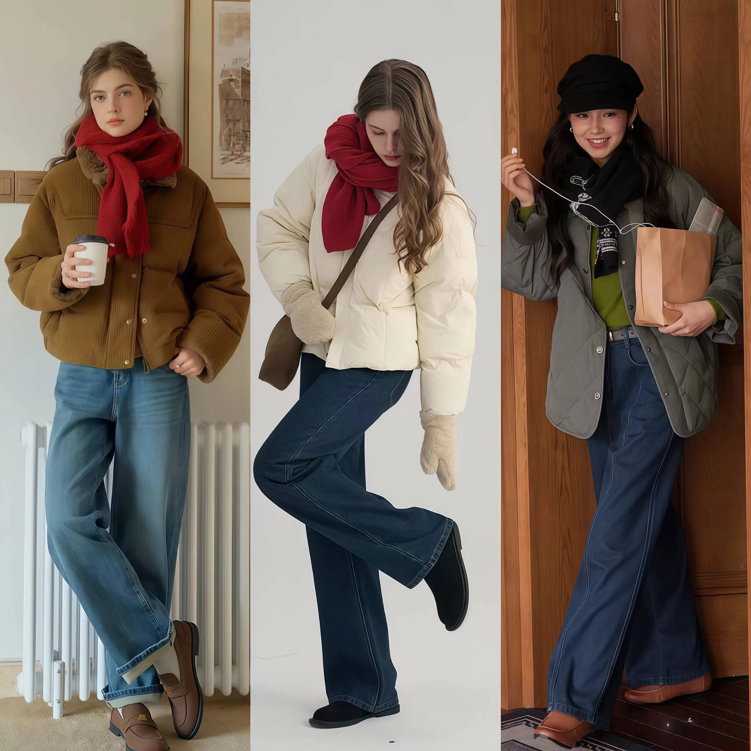 短款羽绒 + 阔腿裤    棕色/军绿短款    米白/深棕阔腿裤    齐踝短靴    复古时髦,藏肉显瘦