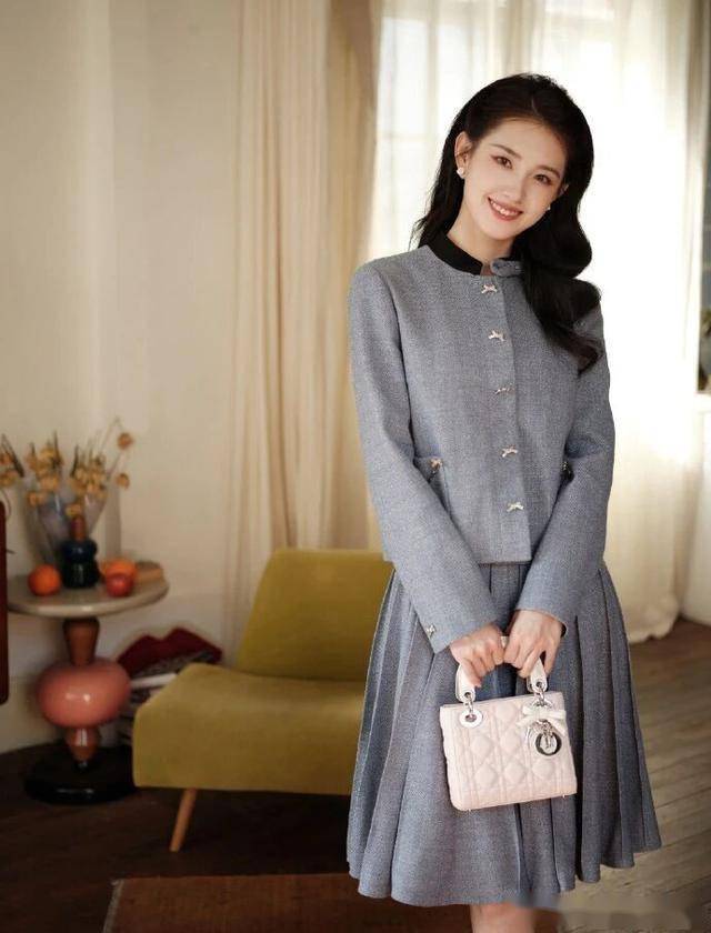 凑近看她的照片,会发现这套 Dior 2026 春夏系列套装,每处设计都踩在 “优雅又少女” 的点上。短款长袖外套的领口缀着小小的蝴蝶结,不是那种夸张的立体款,而是贴在面料上的精致刺绣,风一吹会轻轻晃;外套衣襟上排着银色小蝴蝶结装饰,灯光下会泛着细闪,不仔细看会以为是面料自带的光泽,低调得很讨喜。下身的百褶短裙长度刚好到膝盖上方,走动时裙摆会跟着动作轻轻摆动,不会太短显局促,也不会太长压个子 —— 她 168cm 的身高,被这利落的剪裁衬得比例更顺了。