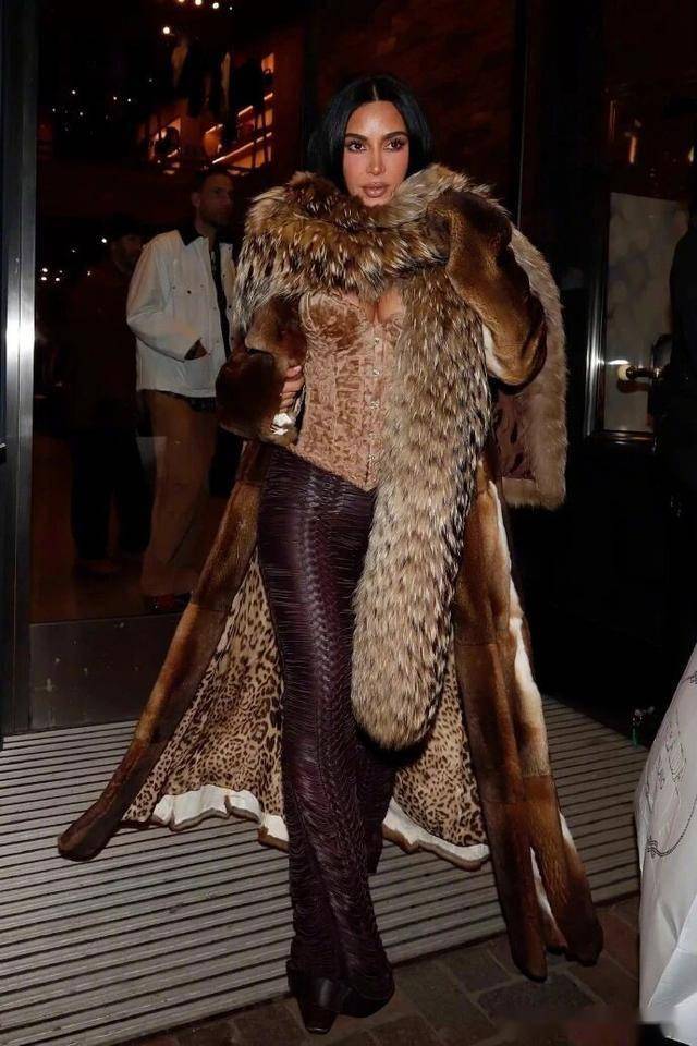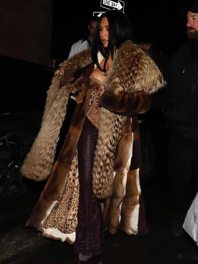 其实这两年时尚圈对皮草的态度特别拧巴,Rick Owens 去年刚宣布全面停止用皮草,不少品牌跟着喊 “可持续时尚”,结果金・卡戴珊偏反其道而行。有人说她 “故意博眼球”,可她哪用得着靠这个?手里的 Skims 估值早超百亿,自己身家 50 亿,穿古董皮草不是为了跟风,是真的懂这种 “旧时光的奢华”——2000 年的 Cavalli 皮草、2005 年的 DG 胸衣,这些不是随便在衣柜里翻出来的,是她专门找的档案款,比穿新款更显品味,也更有态度。