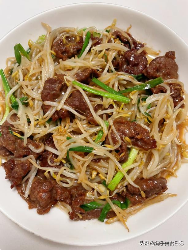 牛肉炒豆芽 材料:适量牛肉,少许盐,生抽,蚝油,玉米淀粉,一勺花生油,一把豆芽,盐,蚝油,葱段。